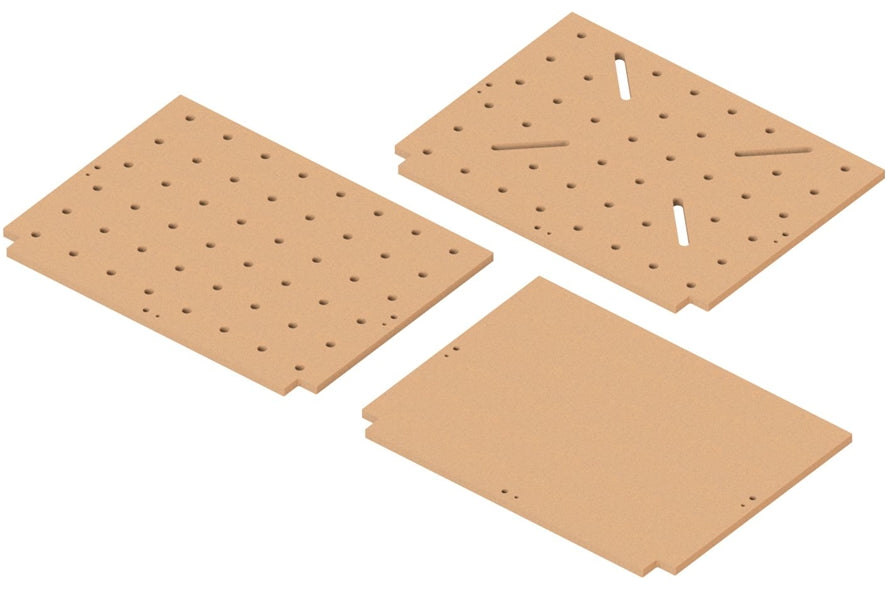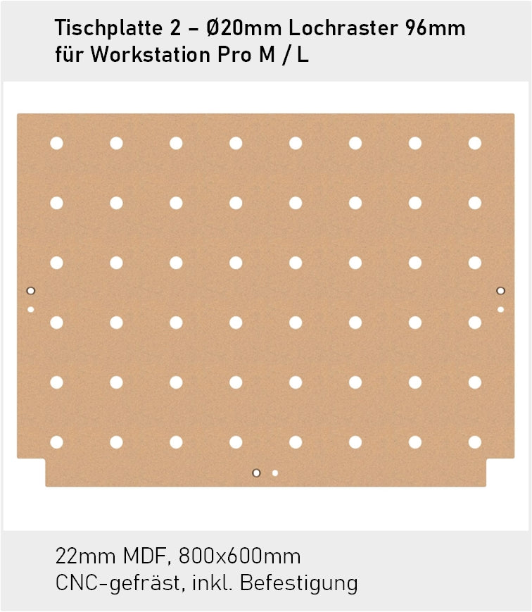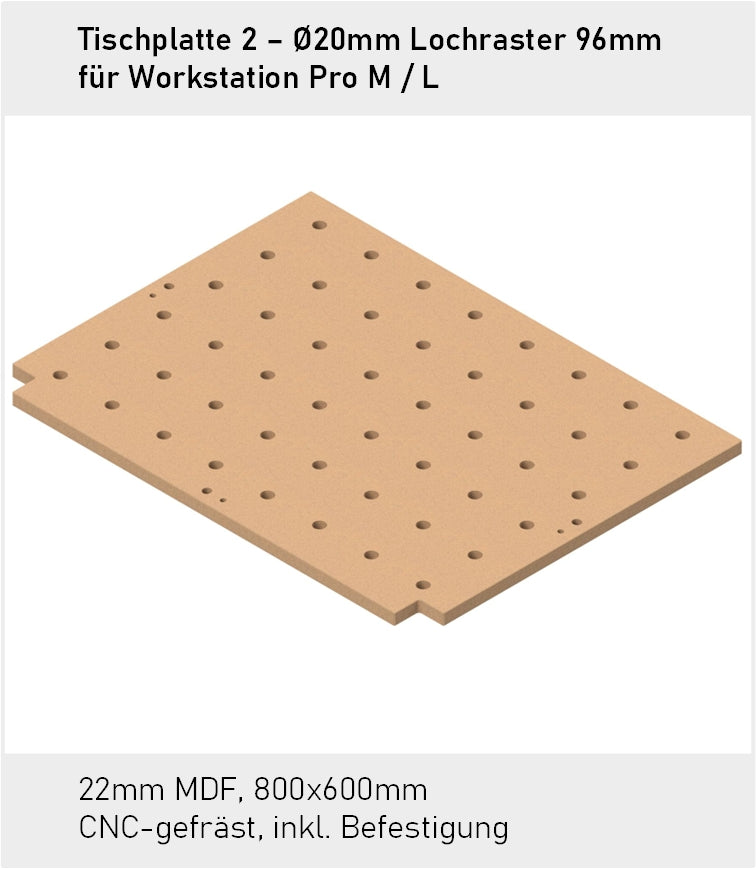 Unsere zweiteiligen Tischplatten bieten Ihnen die Möglichkeit, die Werkbank Workstation Pro optimal an Ihre individuellen Bedürfnisse anzupassen. Sie können verschiedene Ausführungen beliebig miteinander kombinieren. Neben der klassischen Lochplatte mit Ø20 mm Bohrungen und einem Lochabstand von 96 mm sind auch geschlossene Platten und ein Frästischmodul erhältlich. Alle Platten fügen ich bündig auf einer Ebene ein und verfügen über ein einheitliches Befestigungssystem, das den Austausch in weniger als einer Minute ermöglicht.